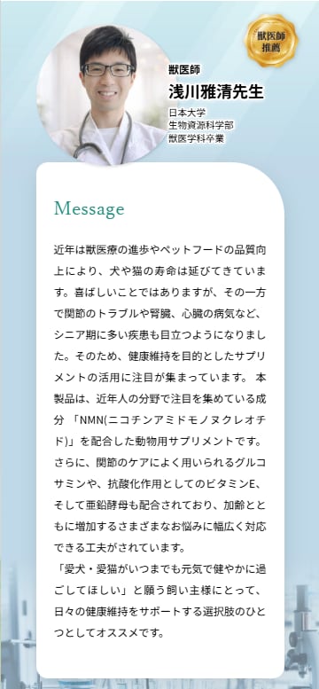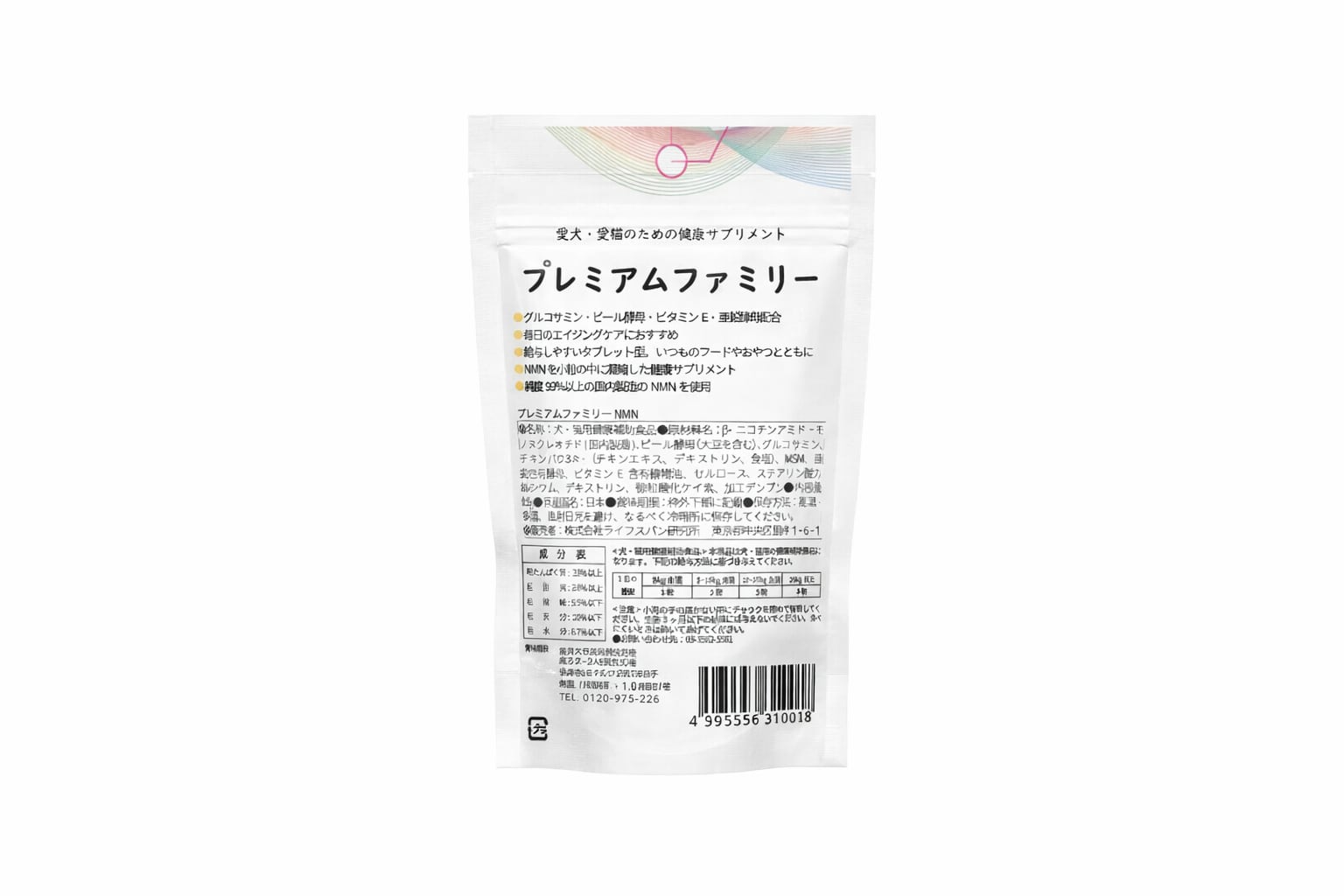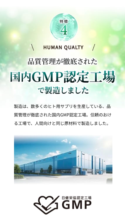 NMNは、小型犬から大型犬そして猫に対して、適量をバランスよく与えられるように1500mg入っています。また、高純度のNMNかつ安心安全のGMP認定工場で製造しており、酸化防止剤、保存料、着色料、発色剤、香料は不使用の国内製造です。また、NMNは純度99%以上を使用しています。