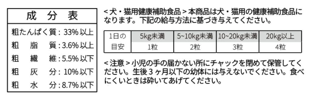 本製品は、犬・猫用の健康補助食品になります。以下の給与方法に基づき与えてください。
